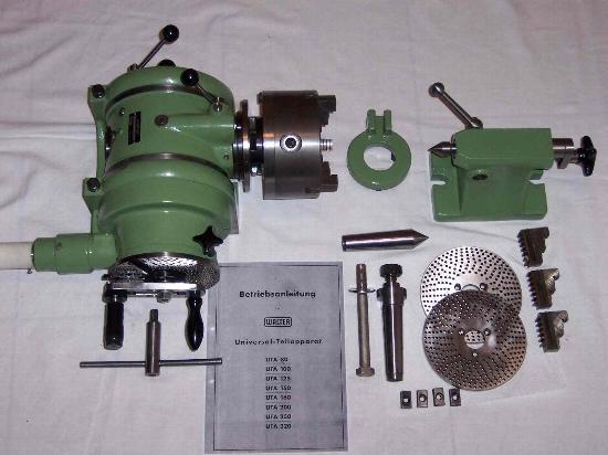Einer meiner liebsten Teilapparate SHU 2 sehen Sie hier im Einsatz (Bild siehe Unten) mit einem Röhm 3-Backenfutter auf einer Kunzmann Fräsmaschine. Er vereint die Vorteile der UTA Modelle mit denen der EST Modelle, da man direkt mit Hilfe des Nonius bis auf 0,2 Grad genau teilen kann (wie bei dem EST-Modell) aber auch mit Hilfe der Teilscheiben.(wie bei dem UTA Model)